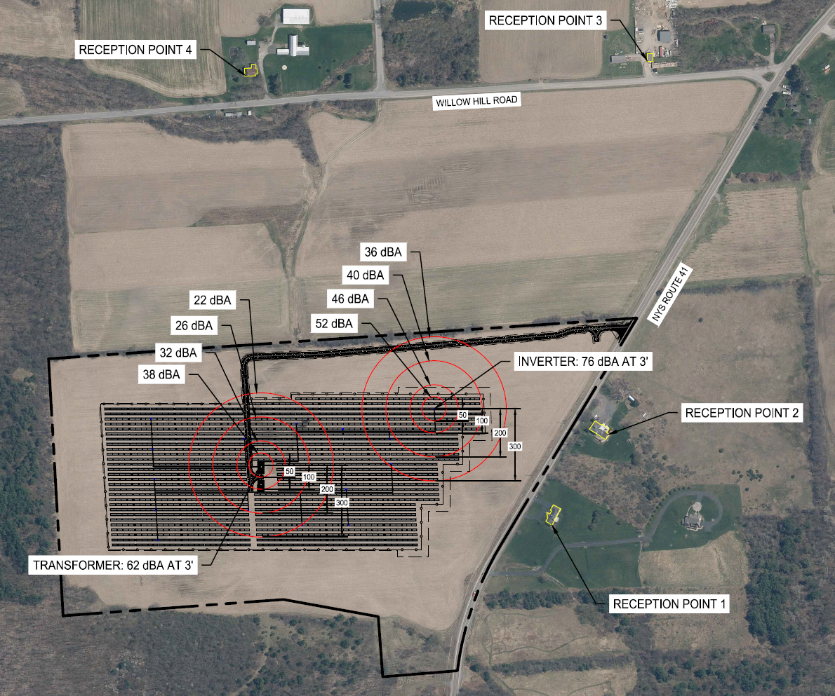 It is noted that acoustic modeling analysis using the inverse square law assumes there are no physical barriers between the reception point and the noise source. As exhibited in the Project Site Plans, the project is naturally surrounded by heavy tree cover to the north and west and light tree cover to the east. This will further reduce the project acoustics from neighboring properties, beyond the results of the study. Proposed vegetative screening will reduce project acoustics to the south. The existing and proposed vegetativebuffers will dampen (reduce) the SPL’s at the reception points (residences). Given the distance of equipment from the surrounding parcels or residential homes and the existing and proposed vegetative screening buffers, acoustic impacts to neighbors are non-significant and no further analysis is required.